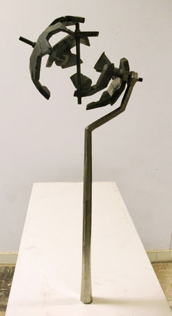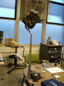Among my own work, GeoGyro is one of my very favorite pieces. Unusually, for me, there was no original drawing at all; I made some patterns to cast in iron that were similar to the GeoPods from GeoVine [prime] and just…went from there. It was chaos! I remember the moment I realized that it should be a kind of 3D gyroscope: absolute elation. As mentioned, the Pod forms on this piece are cast iron. The stand is forged steel; a hexagonal taper cut at a few spots and then welded back together. All of the interior bits, the gears and the rods that hold the head together, are steel as well (with a few brass accents soldered onto the gears). The whole thing is held together using hand-threaded rods and hand-tapped holes, and secured with hexagonal nuts (ground into circles).