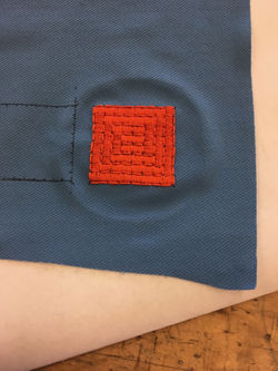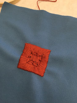 ![]() I was very worried that I would mess up the lining in a way that would cause it to wrinkle or just hang wrong. To mitigate this danger, I ended up anchoring the lining to the outer fabric in the corners of each square. This worked out quite well & was totally covered up by the embroidery. | ![]() |