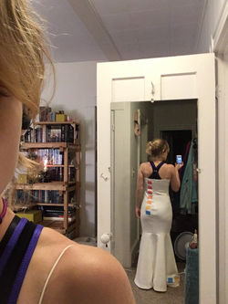 ![]() So finally the fit was acceptable. | ![]() I used paper print-outs pinned to the dress to test out the size and placement of the squares. | ![]() |